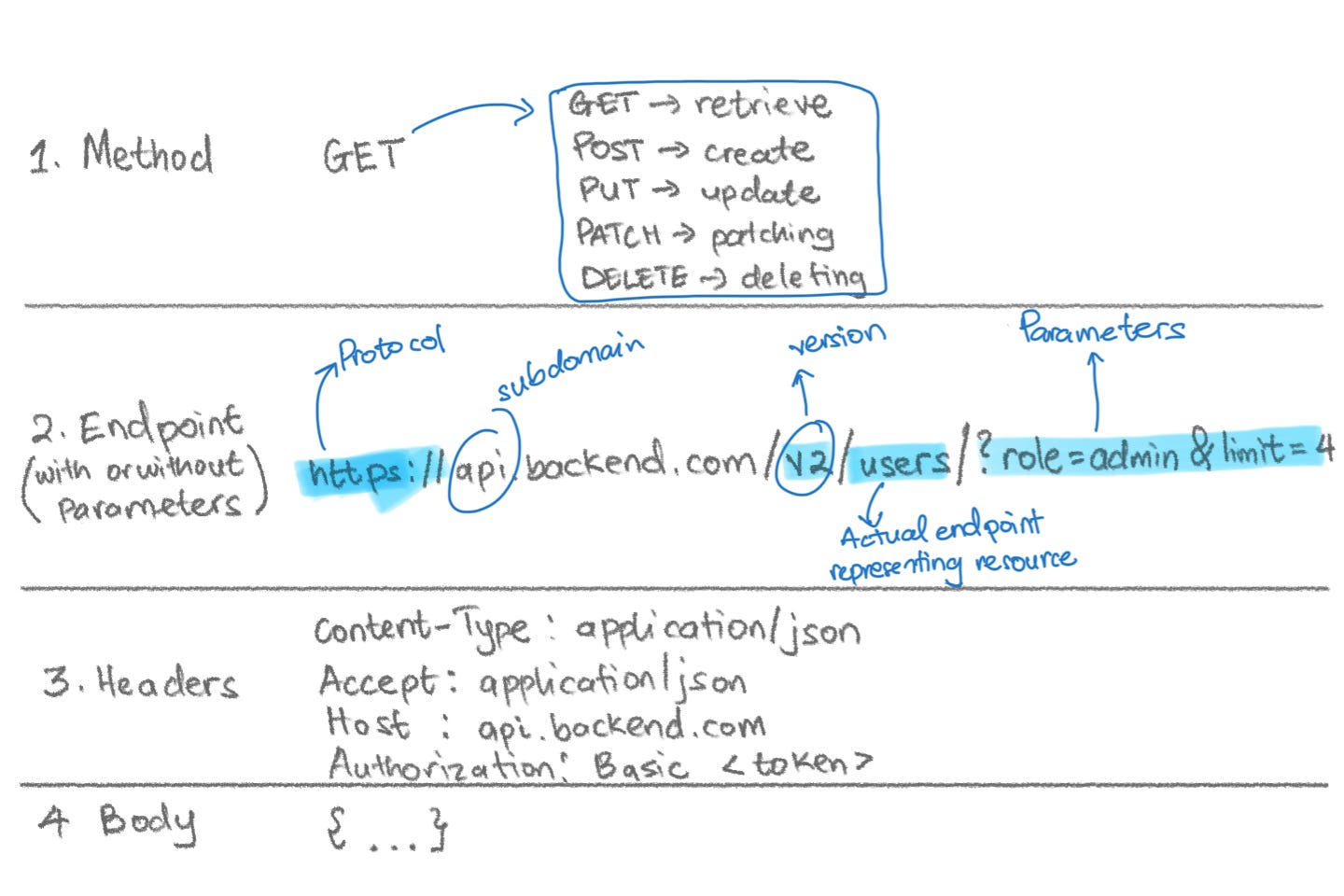 The anatomy of an API request includes a method, endpoint (with or without parameters), request headers and a request body.